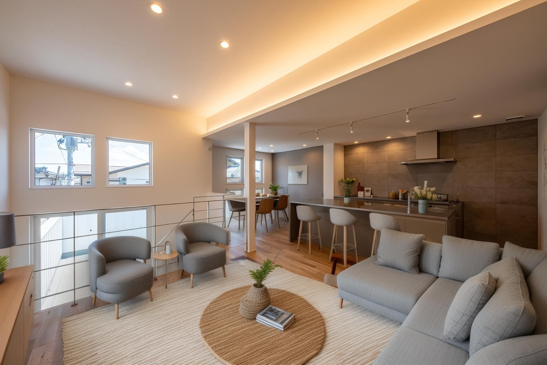 リビングにある大きな吹き抜けにより、どこにいても家族の気配を感じられます。