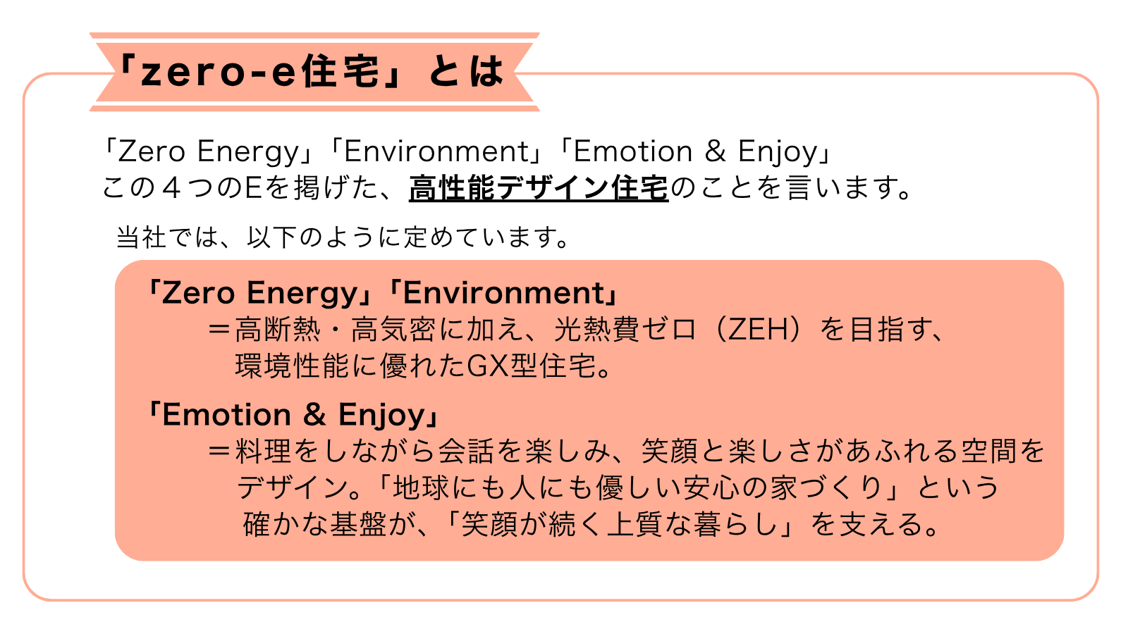 (この住まいの核となるのは、高断熱・省エネ性能に優れた「zero-e」住宅(ZEH水準※以上)です)