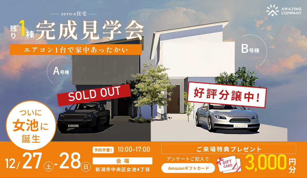![[ 新築 ] 12/27(土)~28(日)開催 zero-e住宅 残り1棟!完成見学会|新潟市中央区女池4丁目【終了】](https://www.amazing-company.jp/cnt/wp-content/uploads/2025/12/meike_1080-1080_02-2.jpg)