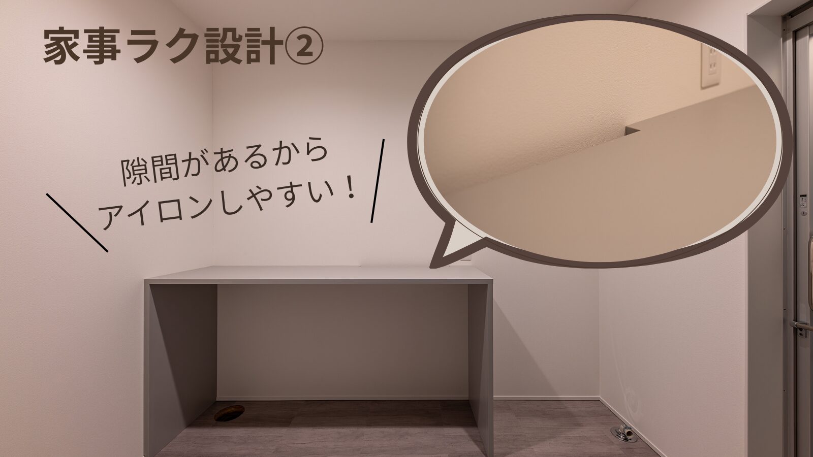 壁と作業台の間に設けた絶妙な「ゆとり」が、長いシャツやスラックスが床に触れるのを防ぎ、せっかく伸ばしたシワを再び作らせない、細やかな配慮が光ります。