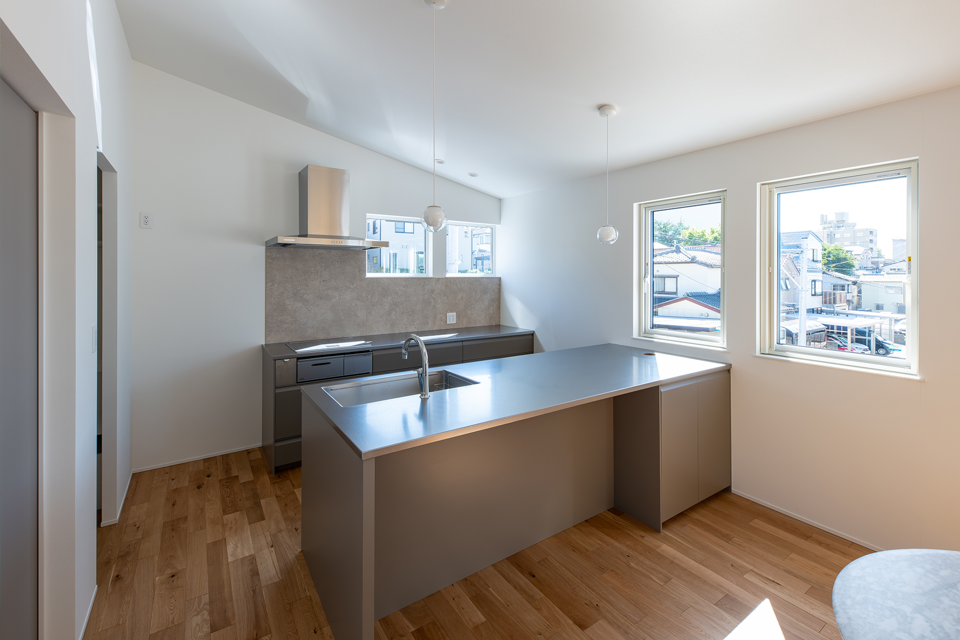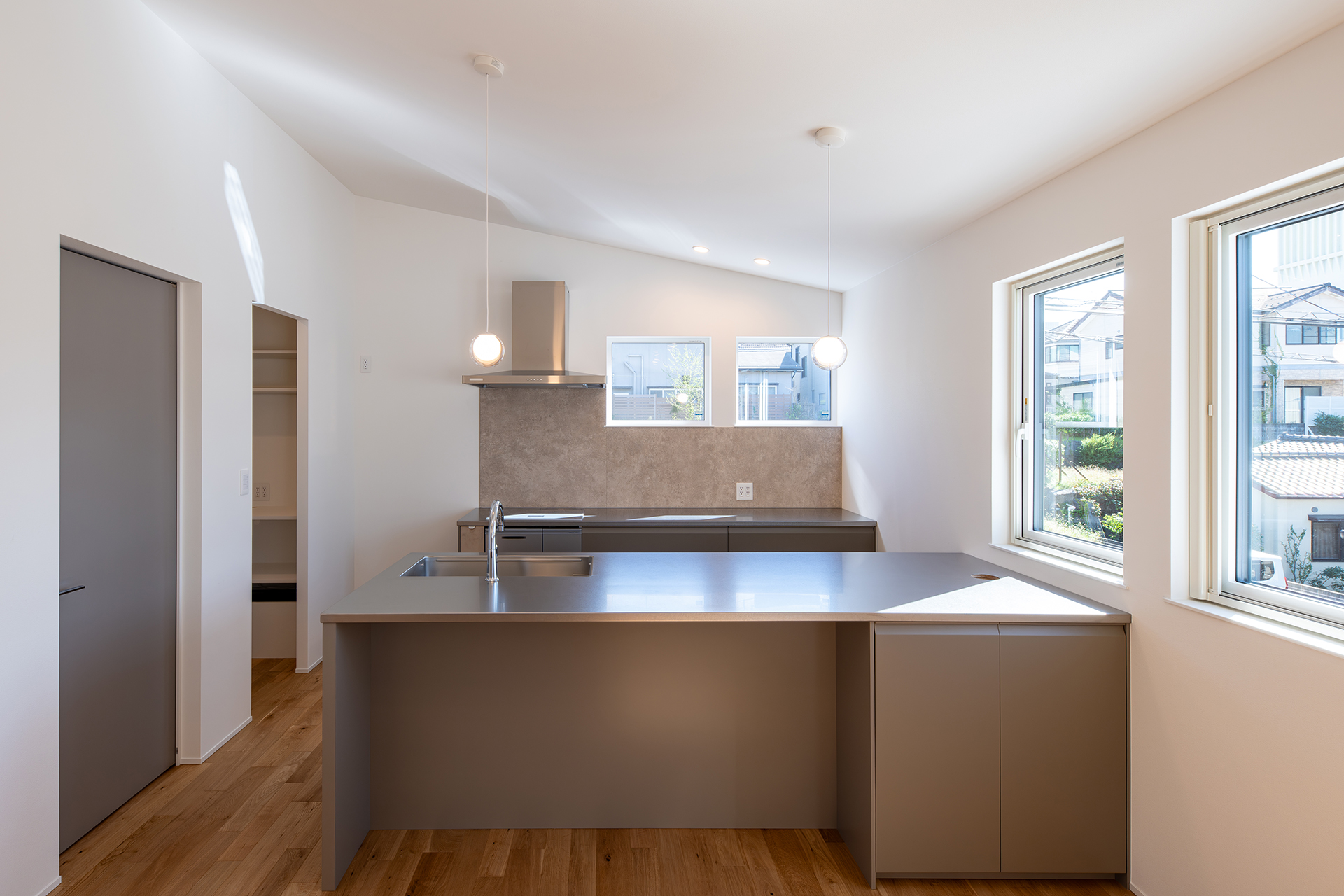 大きな窓から降り注ぐ、まばゆいほどの自然光。日中は照明なしでも心地よい明るさで、キッチン全体に抜群の開放感をもたらします。
