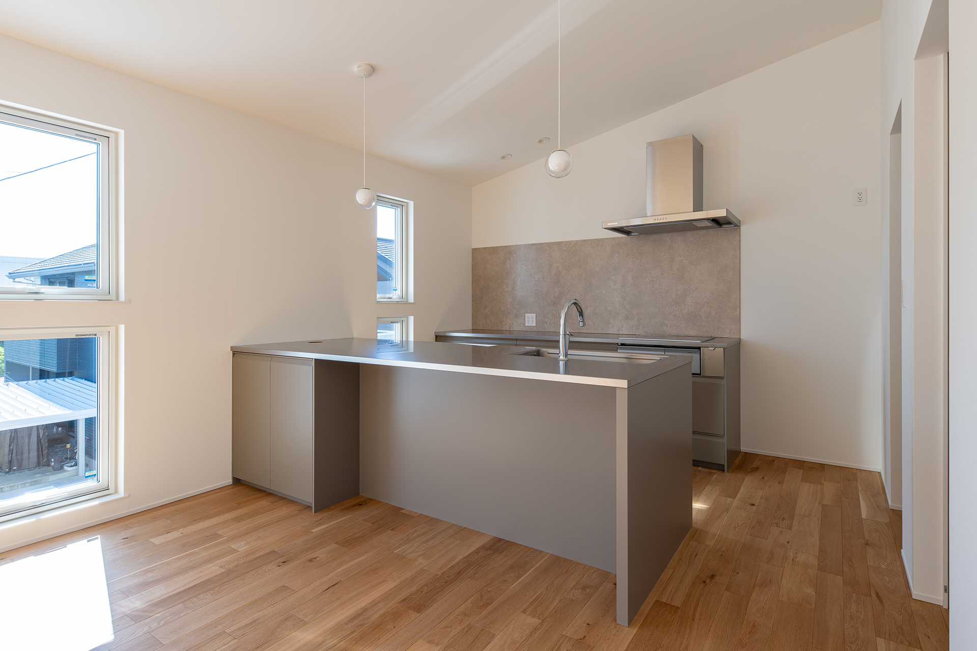 大きな窓から差し込むたっぷりの自然光が、キッチンを明るく照らし、抜群の開放感を生み出します。