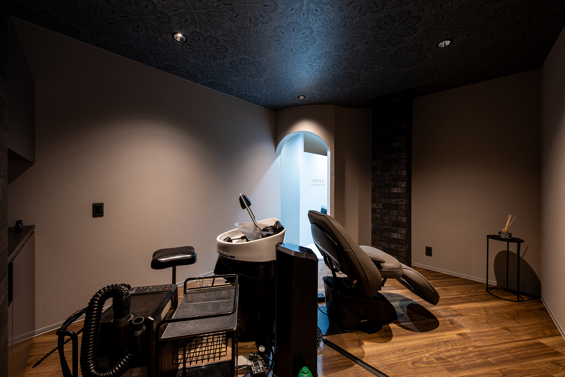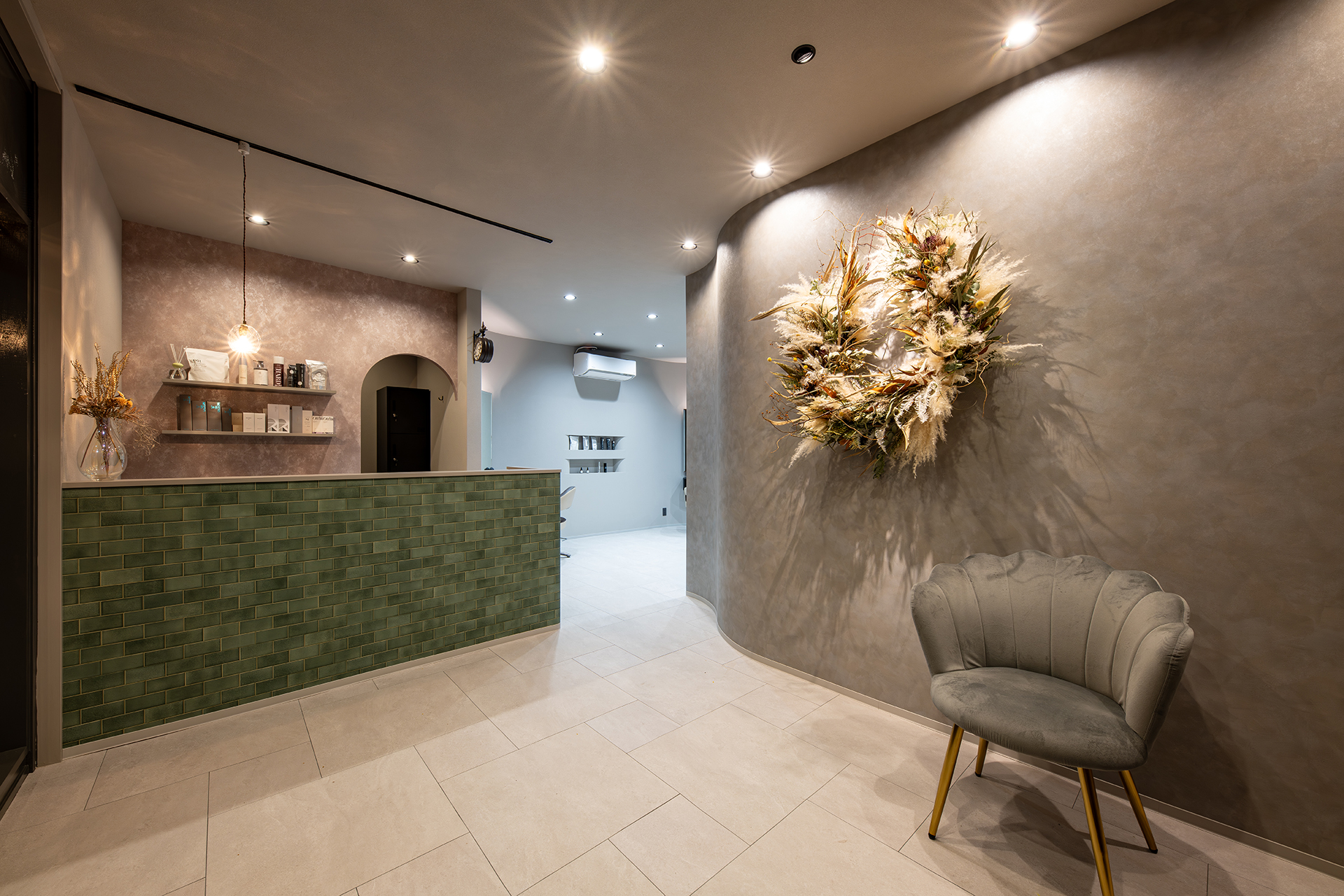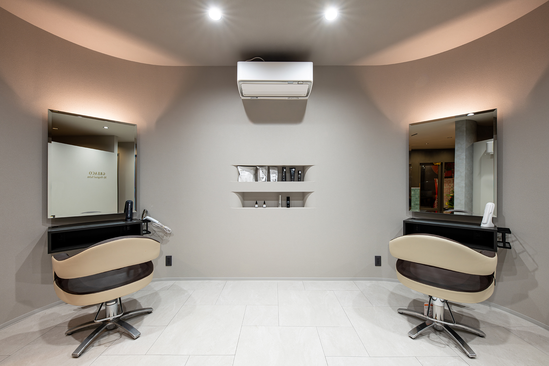 シャンプースペースから続く柔らかなアール(曲線)の壁がお客様を包み込み、まるで舞台の主役を迎え入れるかのようなデザイン性。