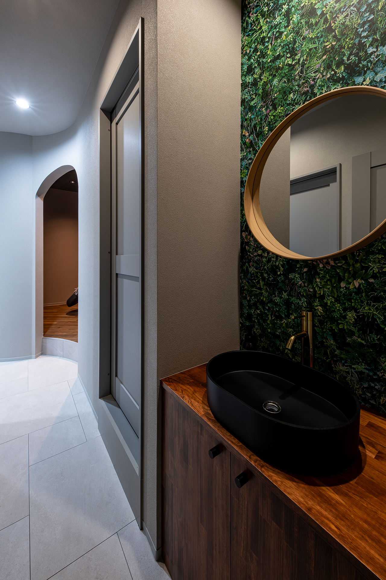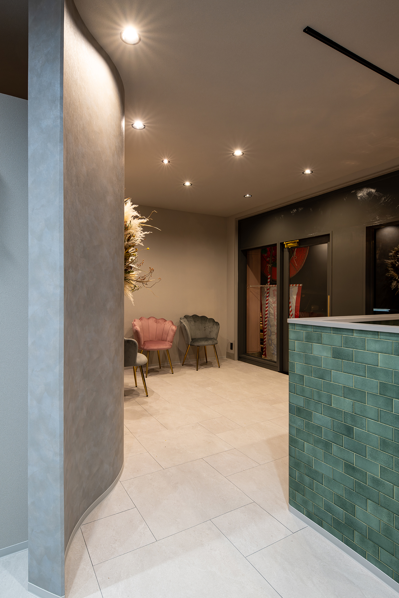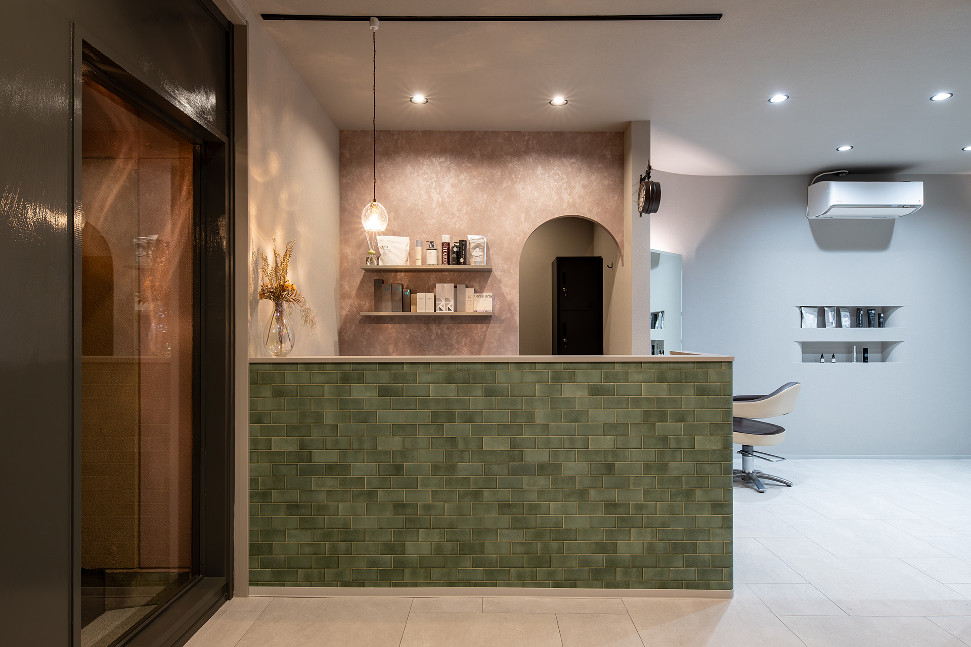 シャンプースペースから続く柔らかなアール(曲線)の壁がお客様を包み込み、まるで舞台の主役を迎え入れるかのようなデザイン性。