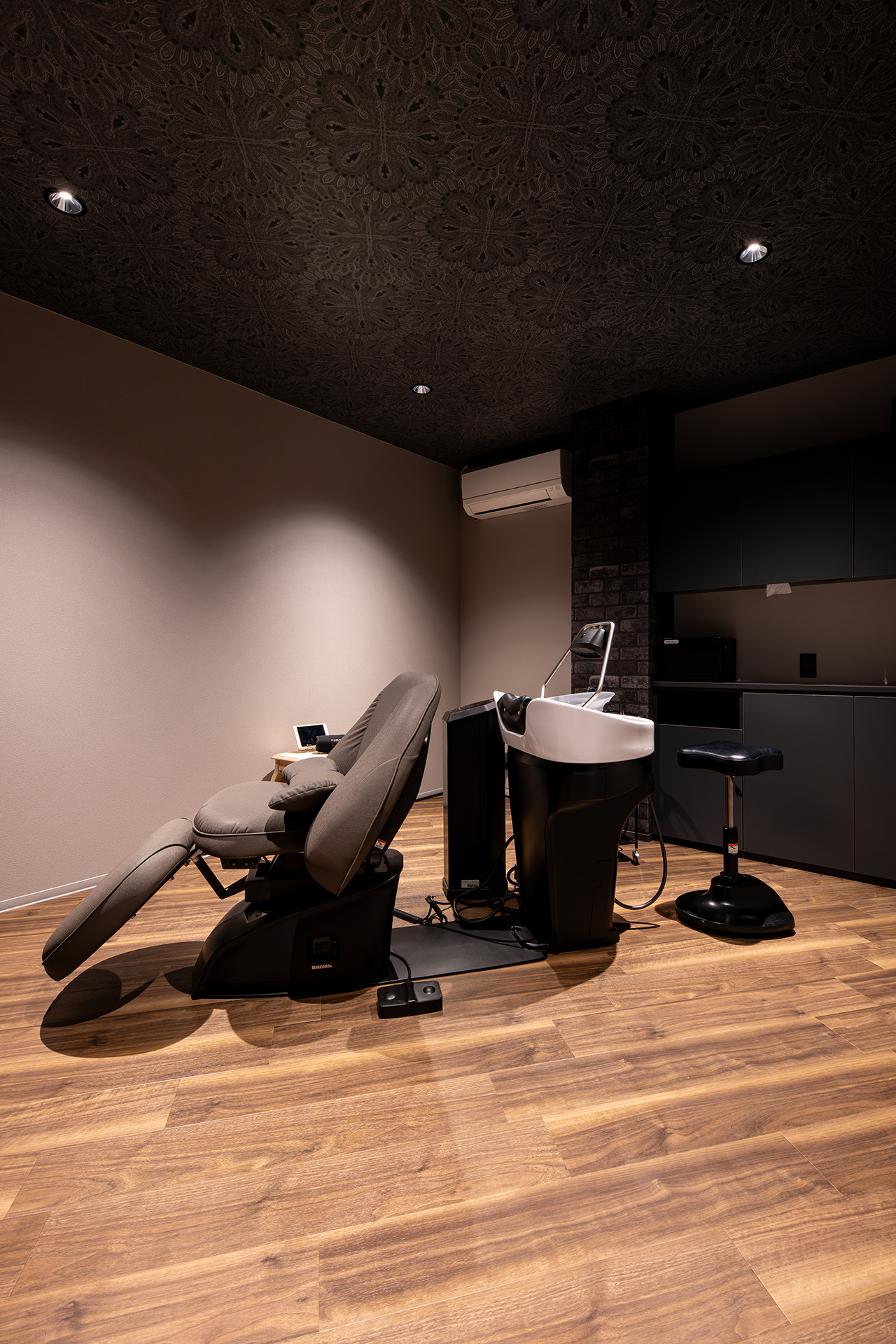 グレーを基調に真鍮や黒のアクセントを添えた、落ち着きあるフェミニンな至福のサロン空間です。